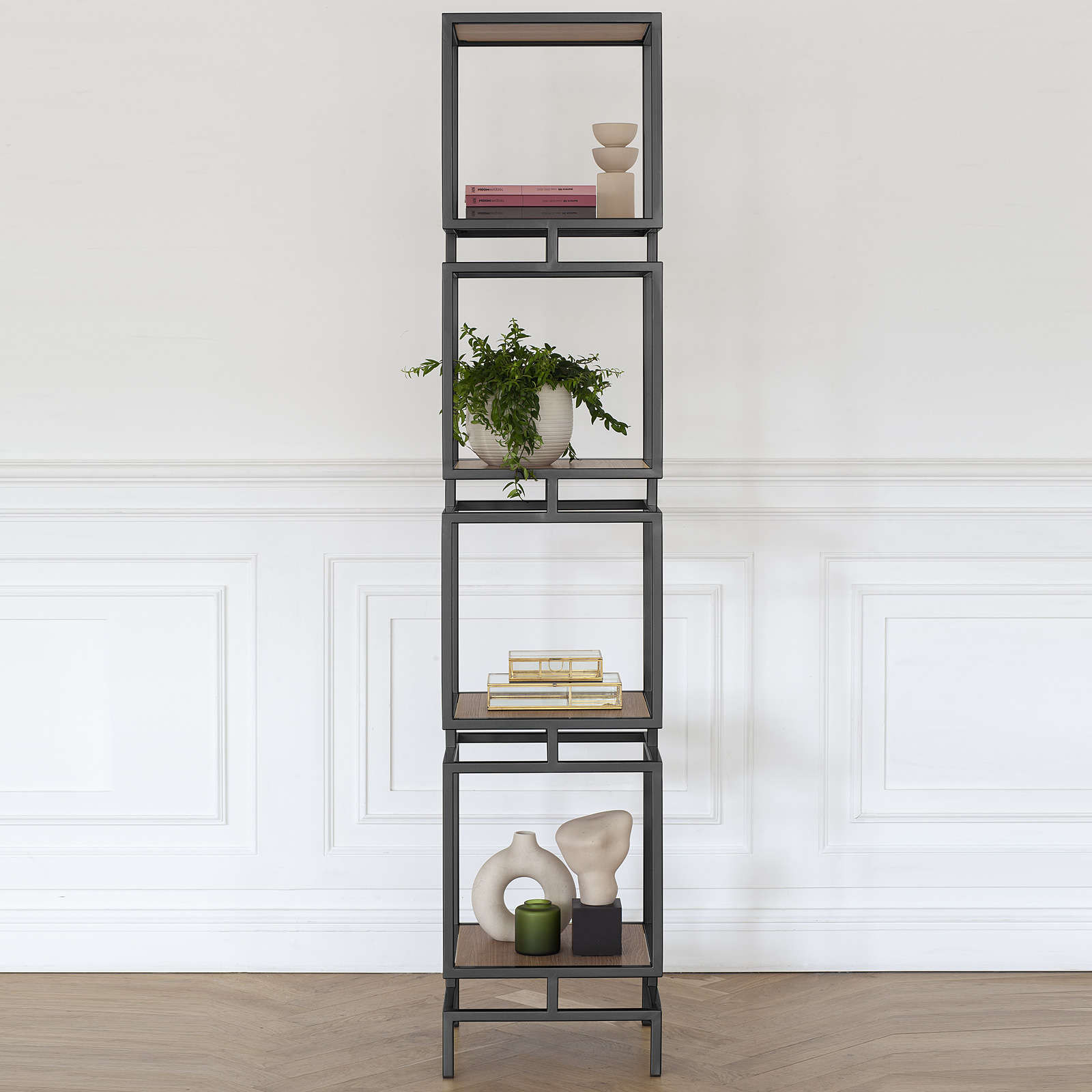 Элегантное сочетание черного каркаса и полок из ЛДСП в цвете Робиния придает интерьеру изысканность и функциональность. Квадратные ниши идеально подходят для хранения вещей, декора и цветов. Стеллаж CUBIC-4 часто выбирают дизайнеры для зонирования в стиле лофт, минимализм или сканди.