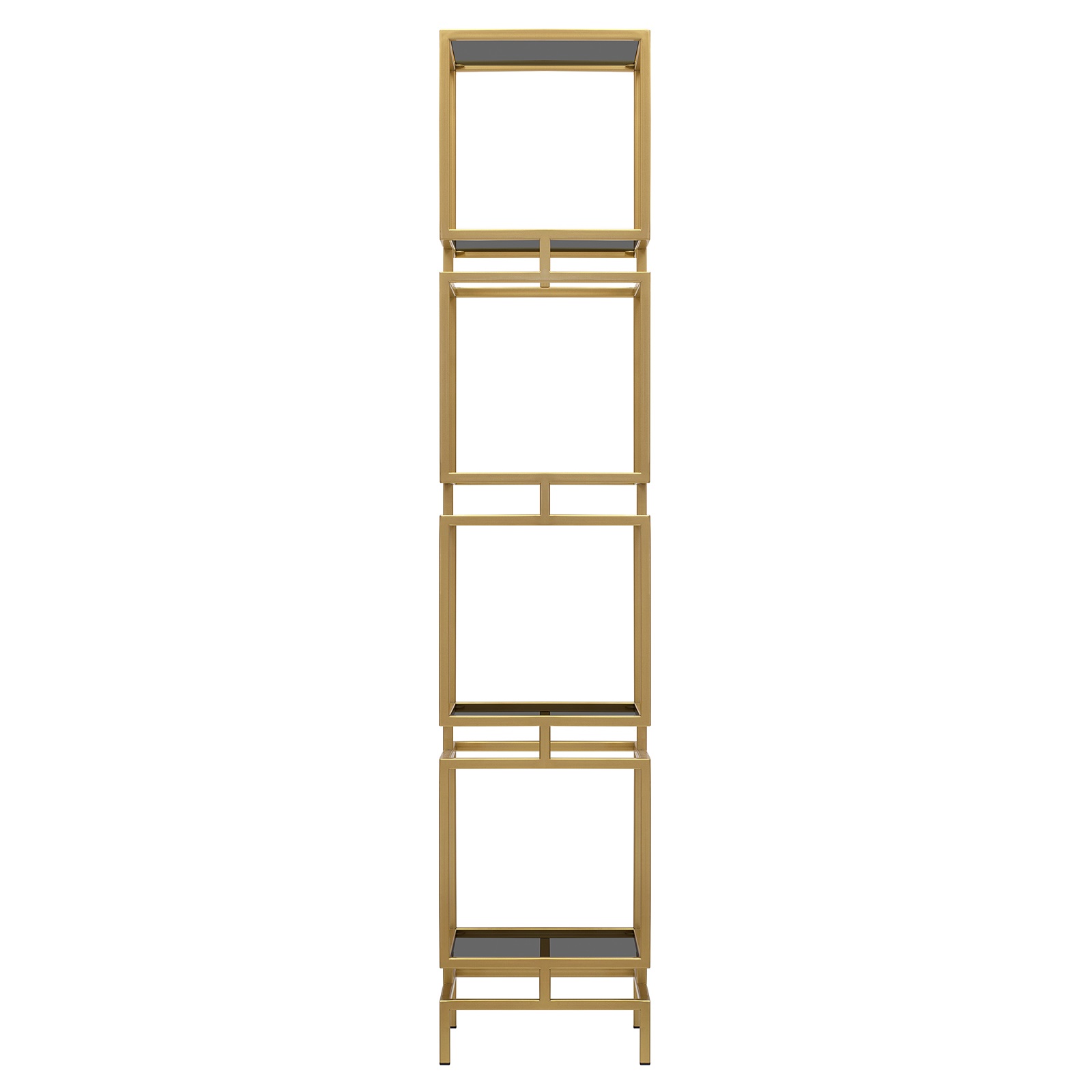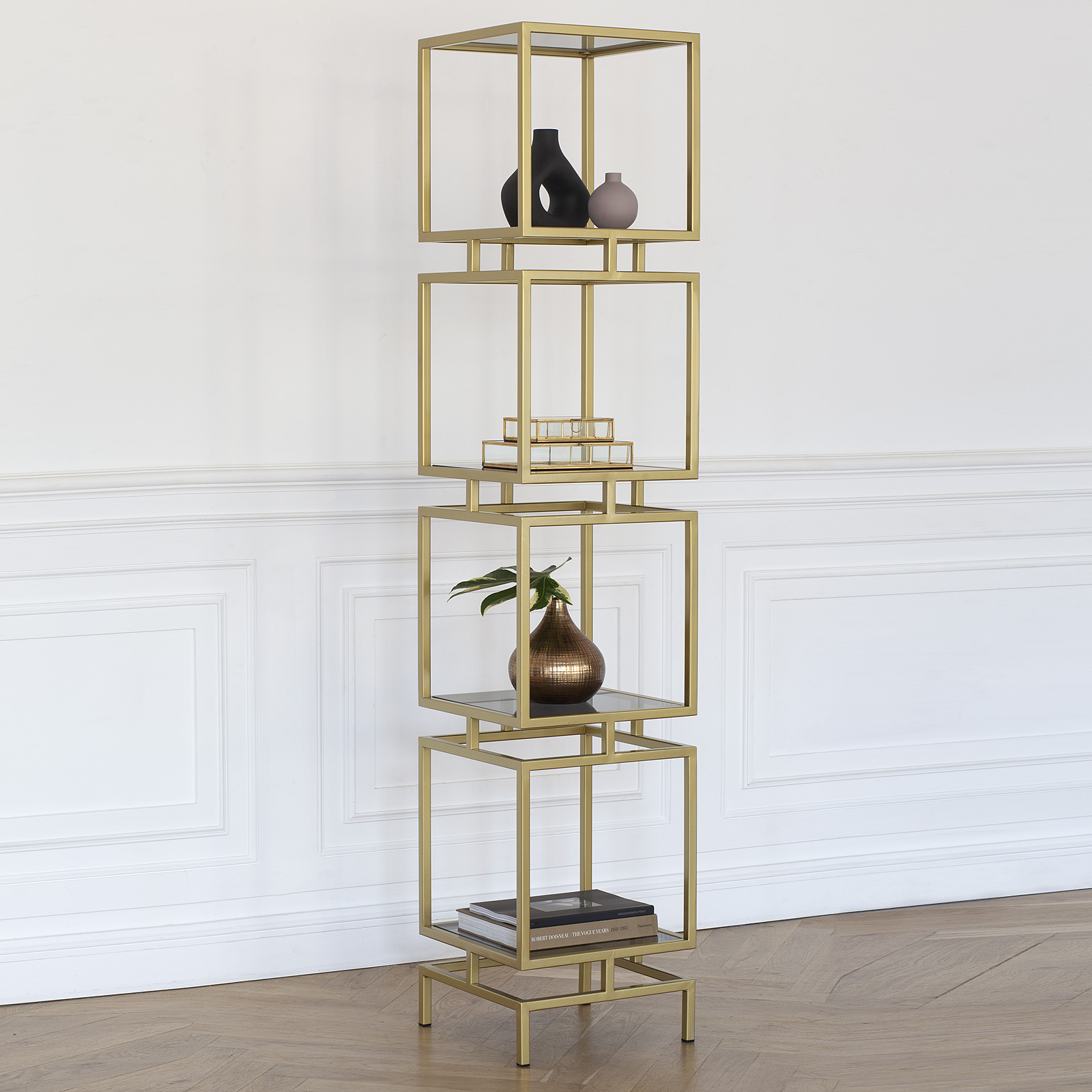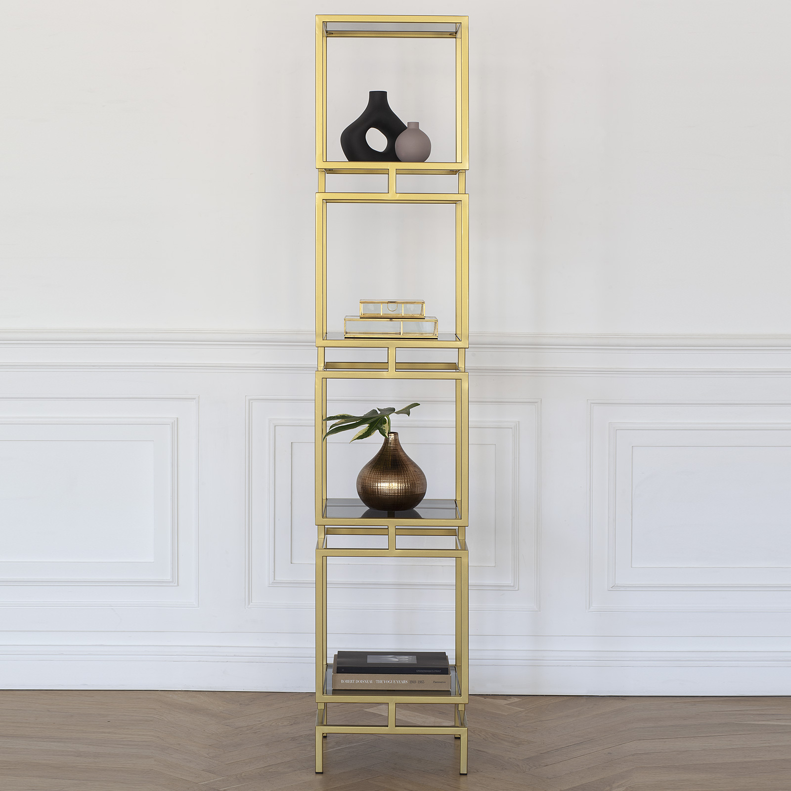 Золотой металлический стеллаж CUBIC-4 с полками из закаленного тонированного стекла привлекает внимание элегантным дизайном и функциональностью.