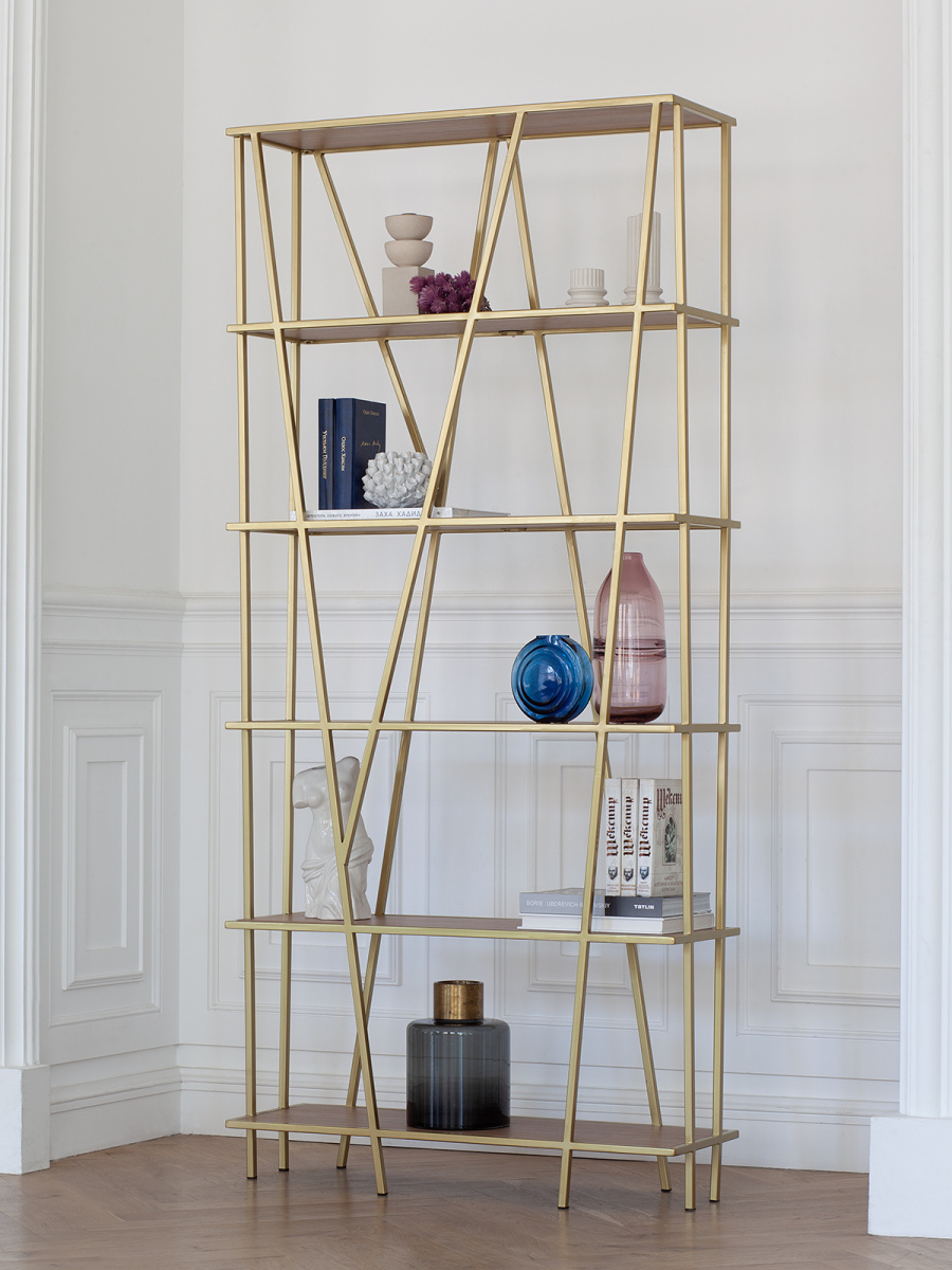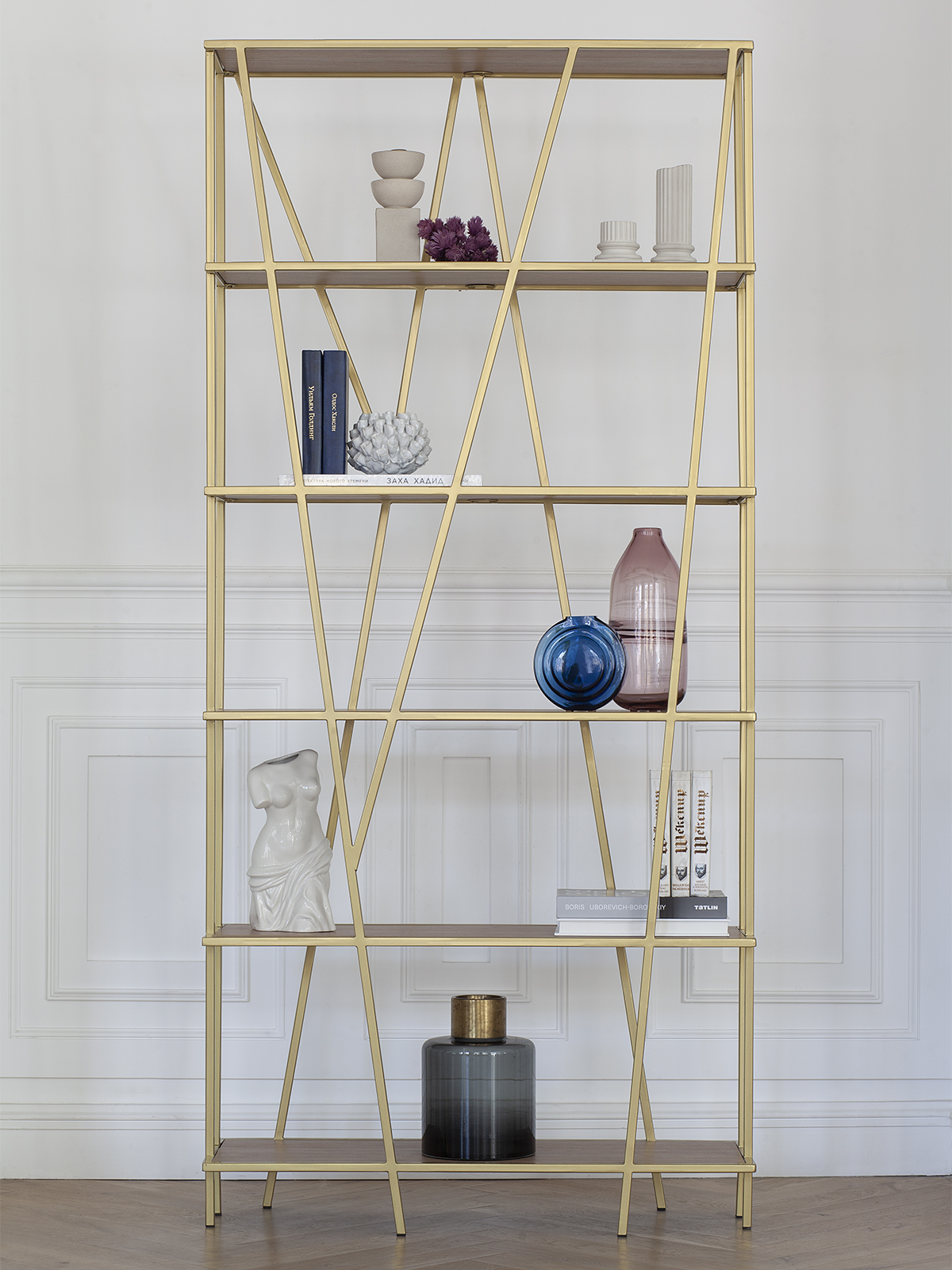 Сочетание золотого каркаса и древесного рисунка на полках делает стеллаж EVA особенно привлекательным. Полки из ЛДСП толщиной 8 мм выдерживают нагрузку до 10 кг. Полки можно использовать для хранения декора, бытовой техники, игрушек, фотографий или комнатных растений. Стеллаж не требует крепления к стене, он устойчив благодаря собственному весу.