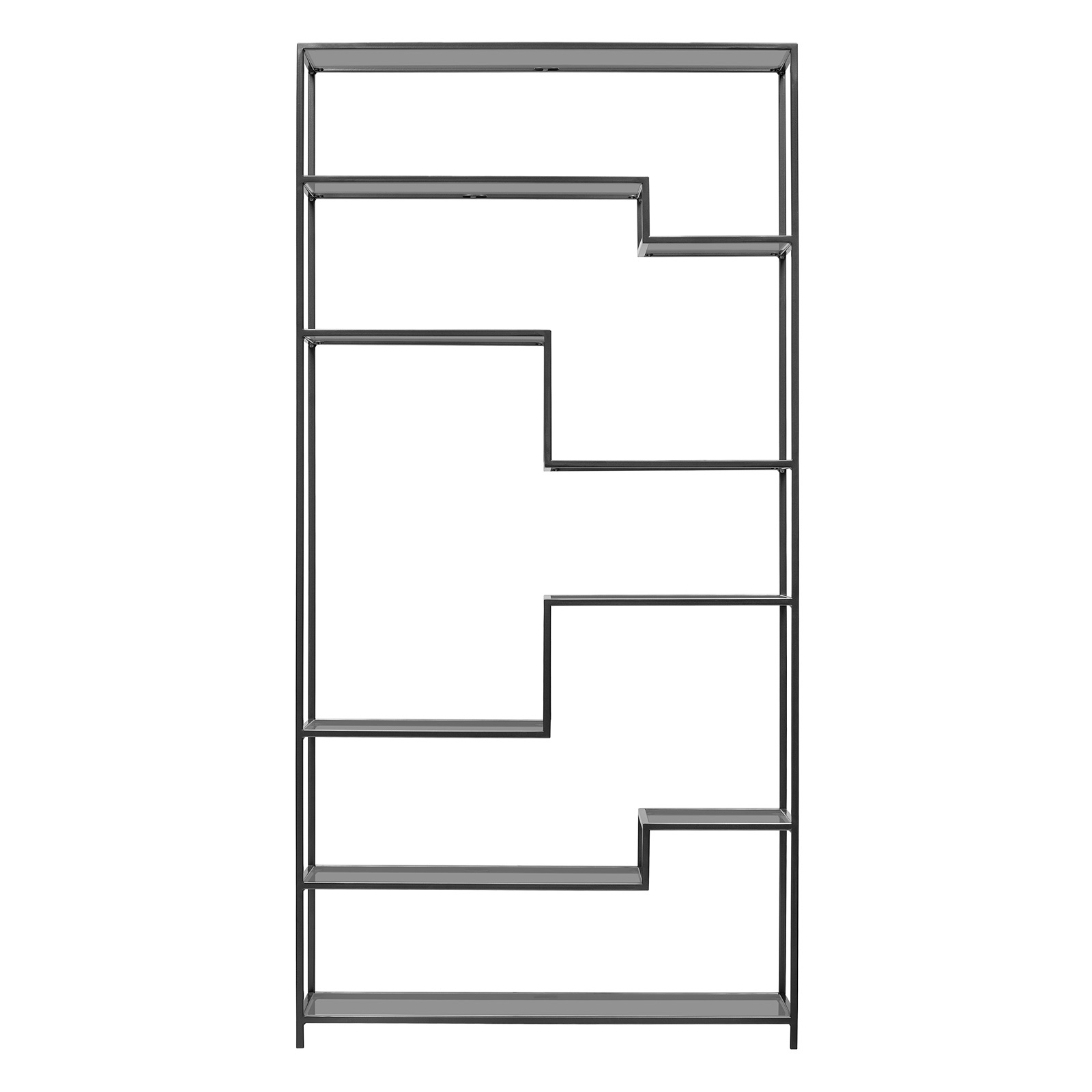 Черный стеллаж JAQLENE с полками из тонированного стекла. Стеллаж в стиле лофт подойдет для квартиры, загородного дома, офиса и салона. Каркас стеллажа изготовлен из стали с полимерным покрытием.