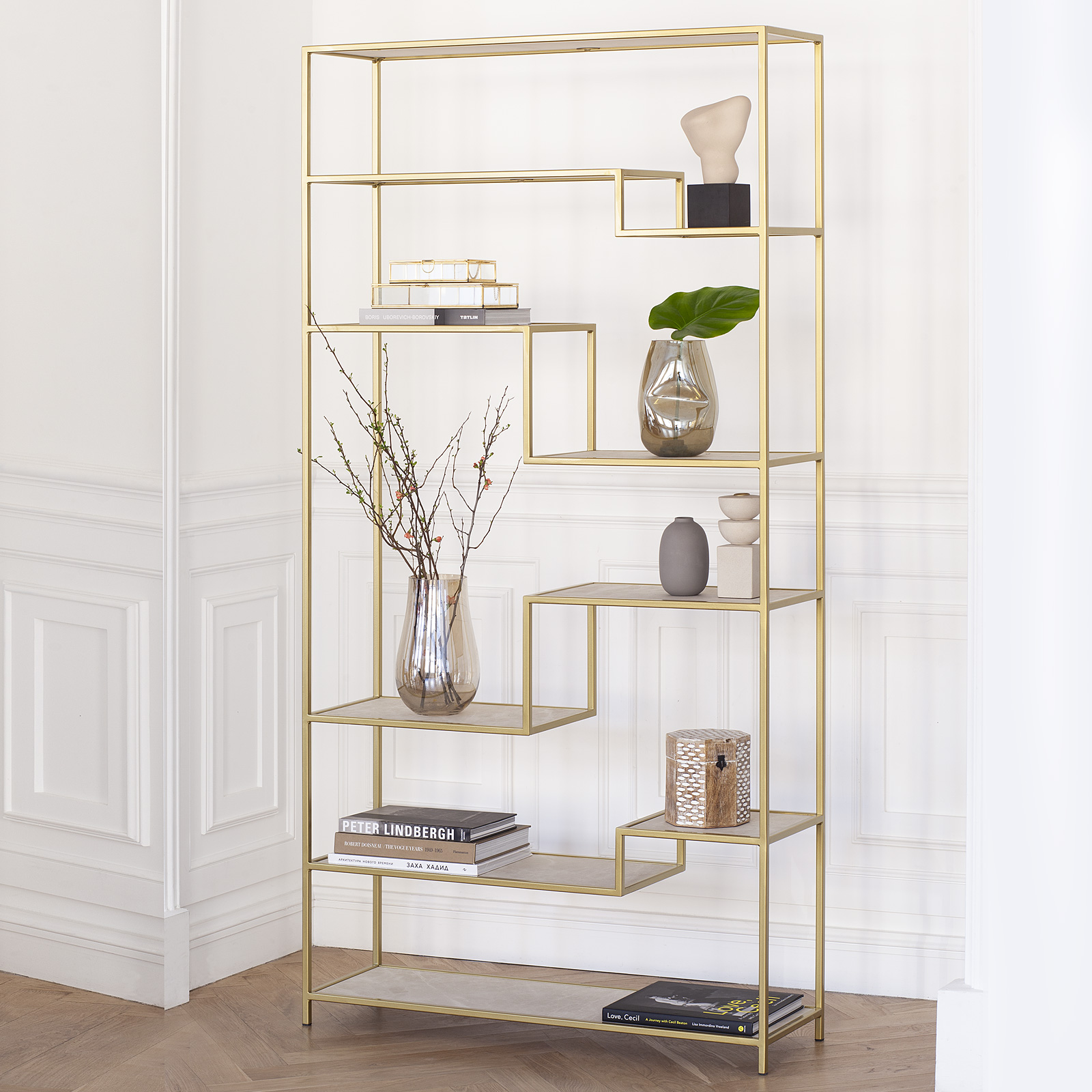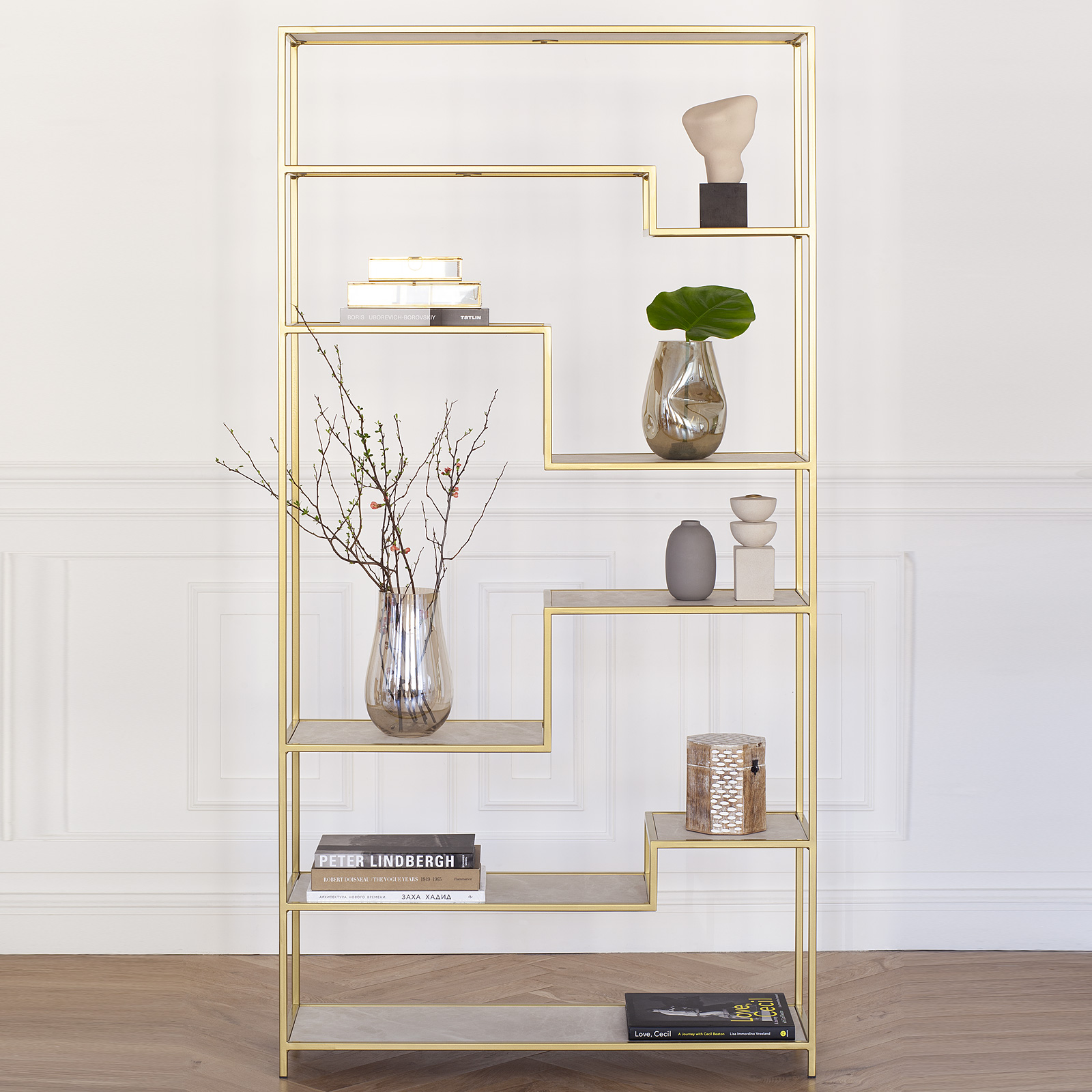 Вместительный стеллаж JAQLENE создает уникальный дизайн и зонирует помещение. Утонченное сочетание золотого каркаса и полок из натурального камня позволит разместить стеллаж в любом интерьере.
