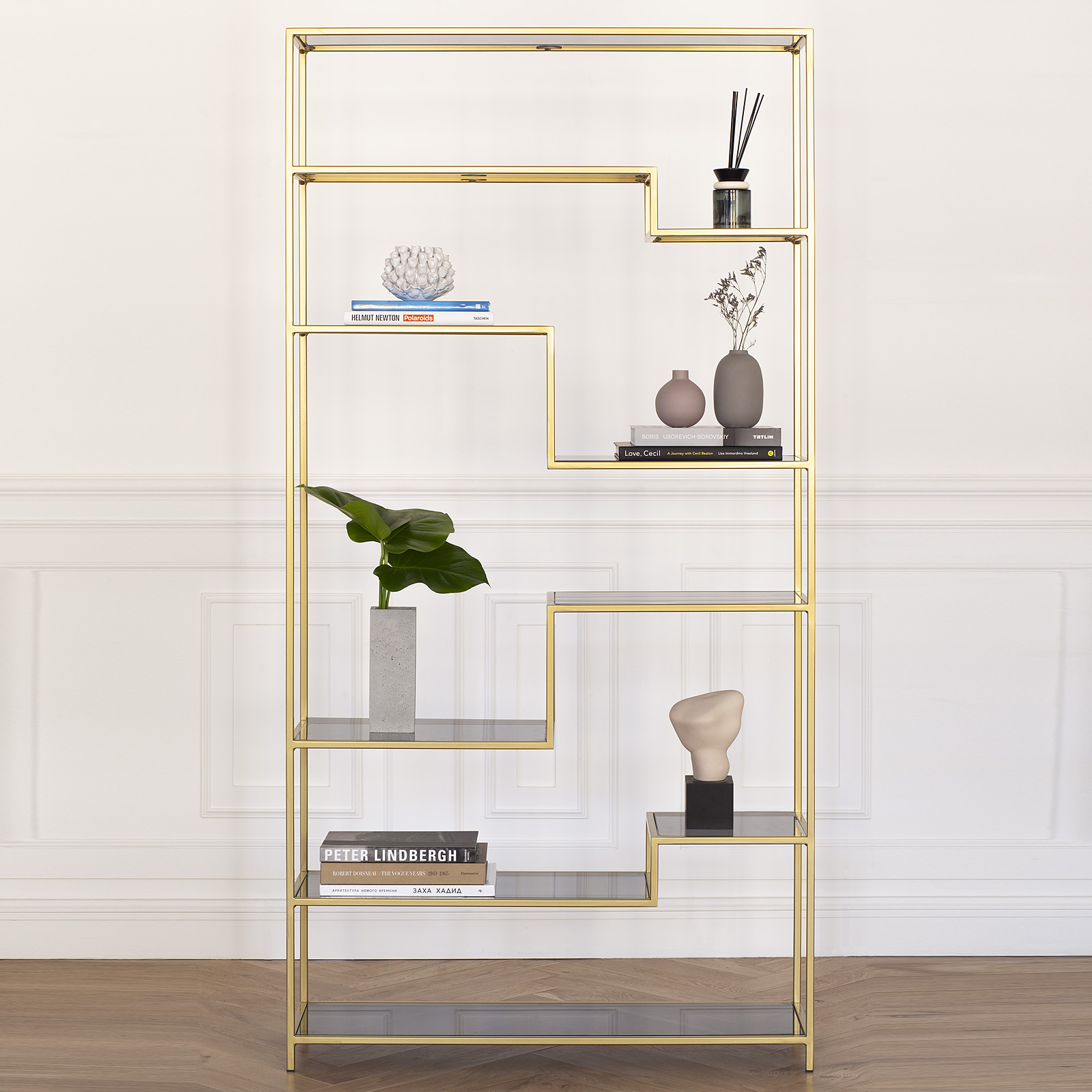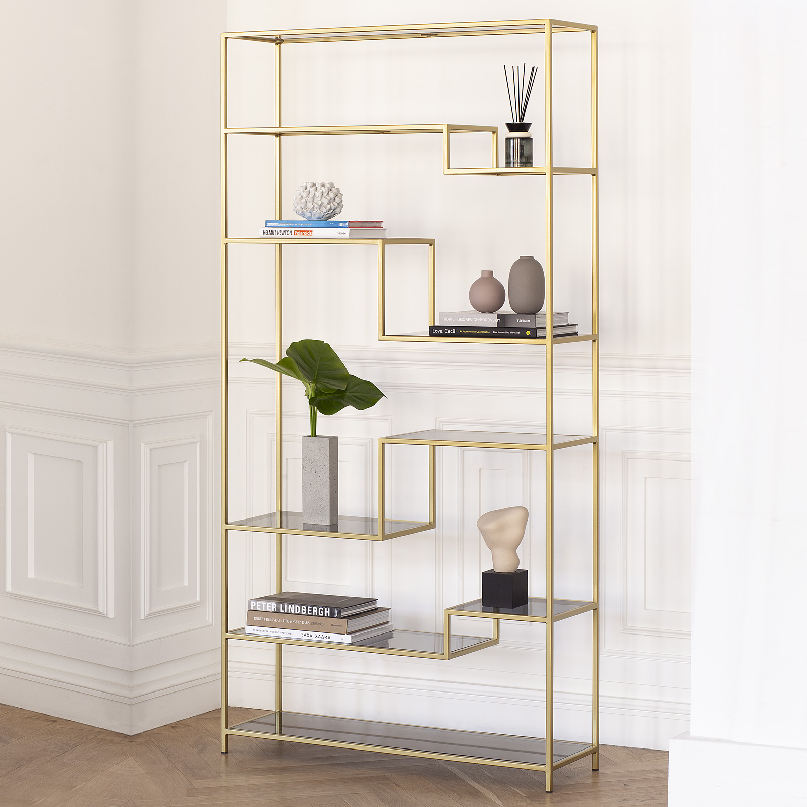 Вместительный стеллаж JAQLENE создает уникальный дизайн и зонирует помещение. Утонченное сочетание золотого каркаса и полок из тонированного стекла позволит разместить стеллаж в любом интерьере.