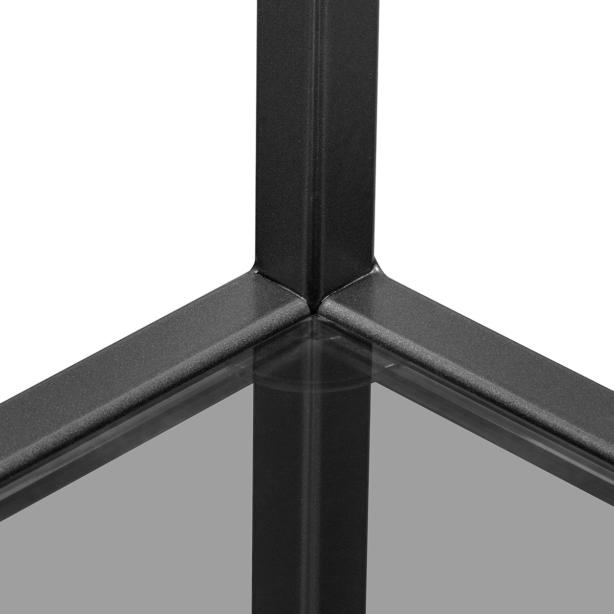Черный металлический стеллаж KARIN с полками из закаленного тонированного стекла привлекает внимание элегантным дизайном и функциональностью.