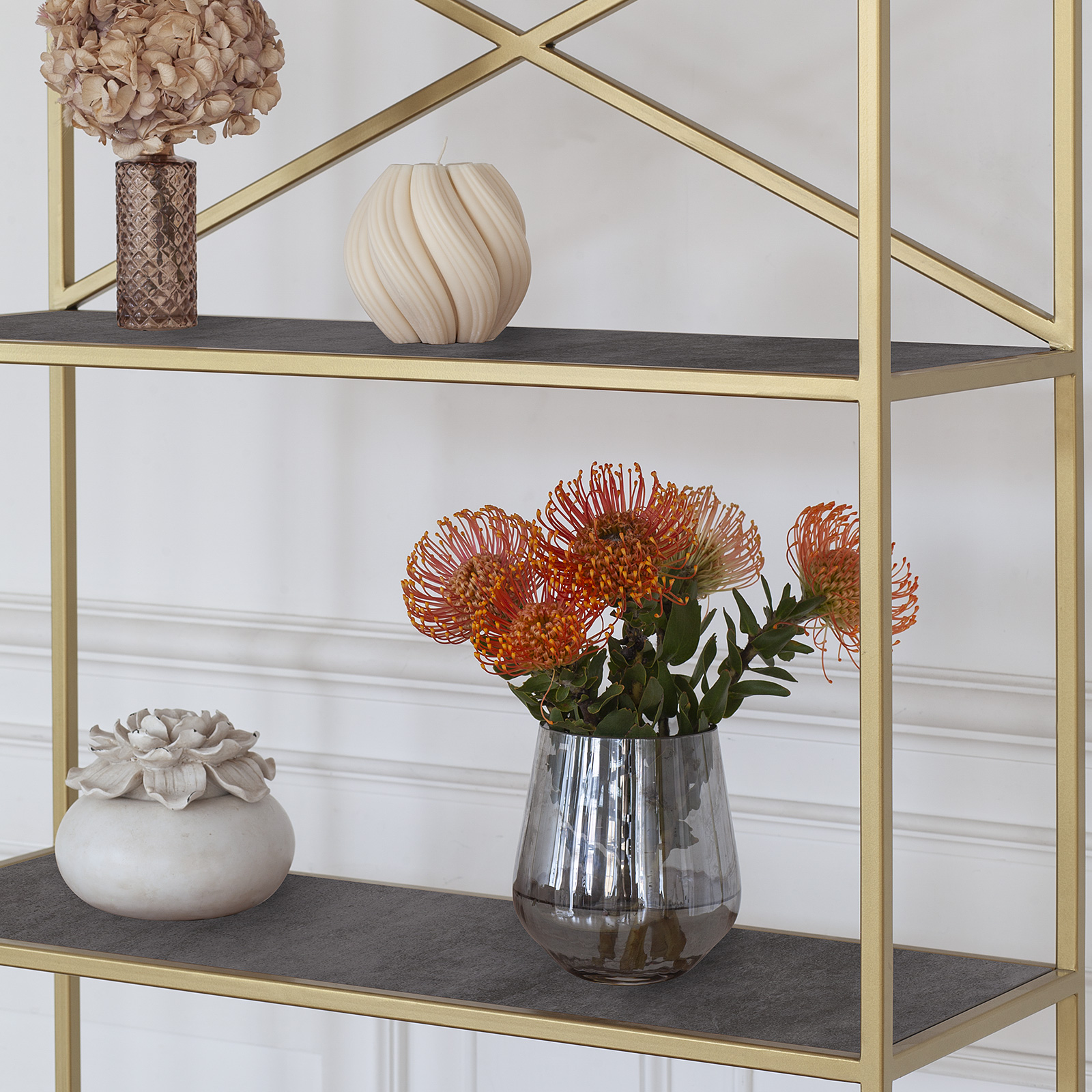 Золотой металлический стеллаж KARIN с полками из натурального камня привлекает внимание элегантным дизайном и функциональностью.