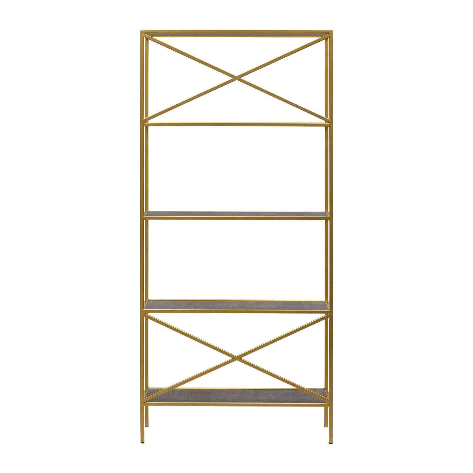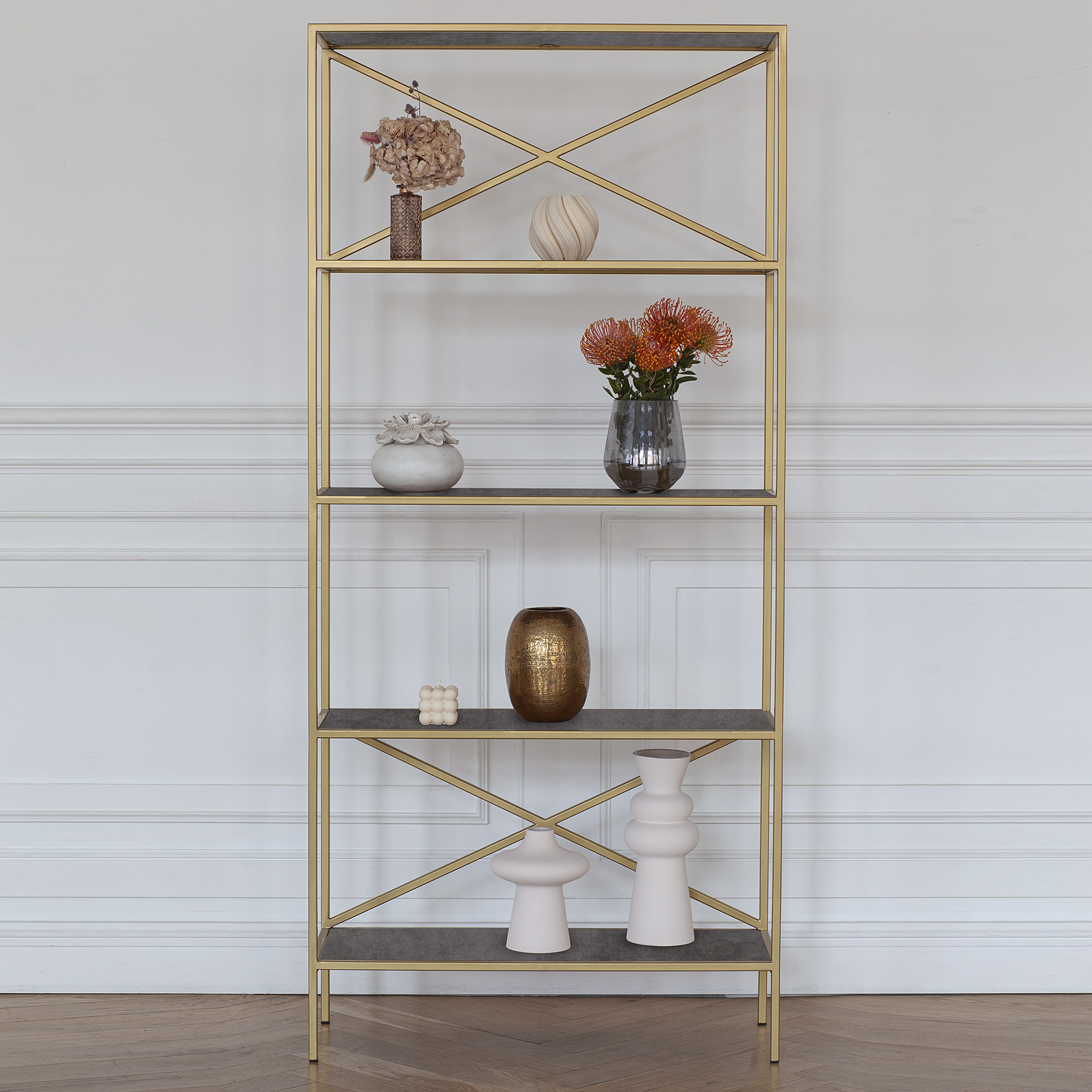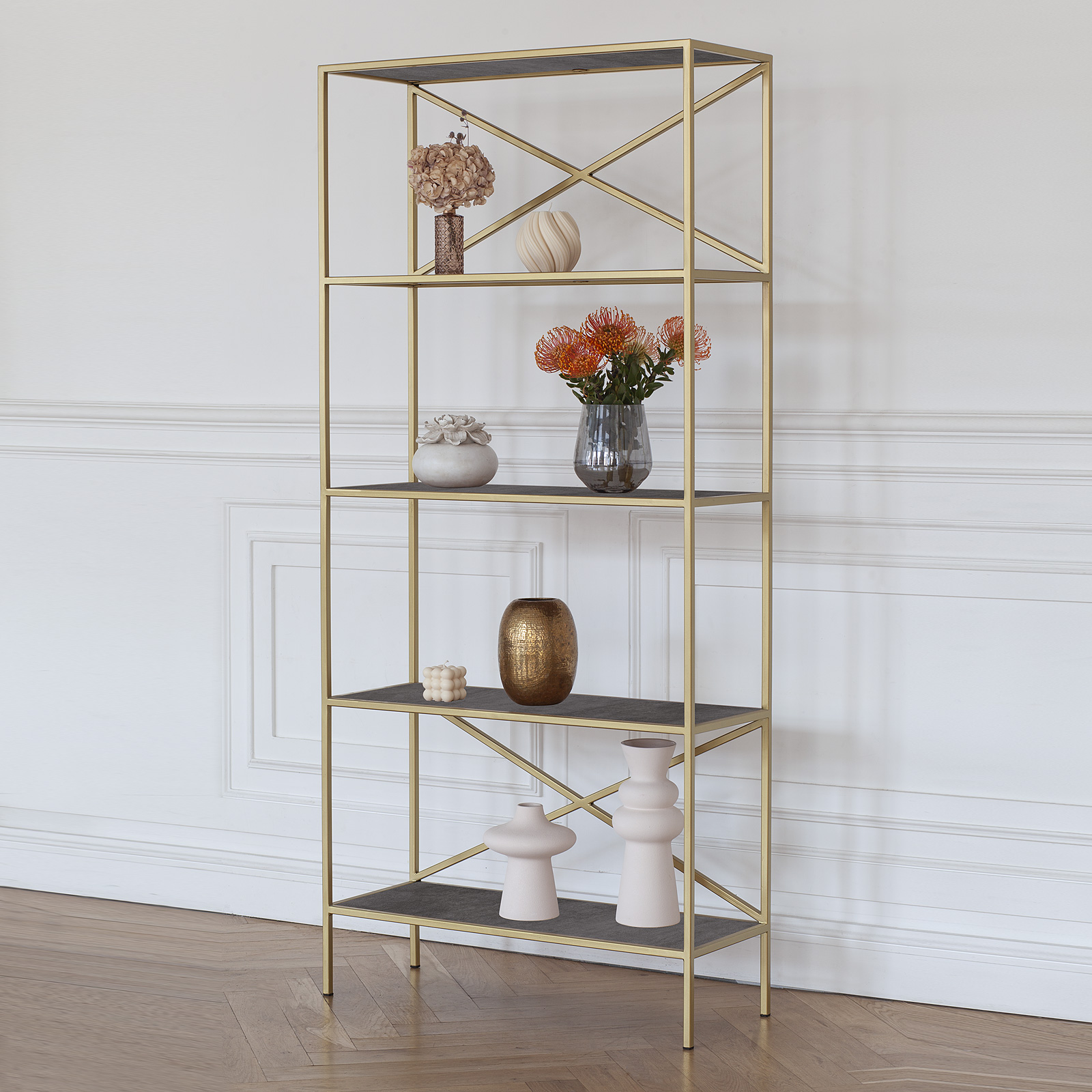 Вместительный стеллаж KARIN создает уникальный дизайн и зонирует помещение. Утонченное сочетание золотого каркаса и полок из натурального камня позволит разместить стеллаж в любом интерьере.