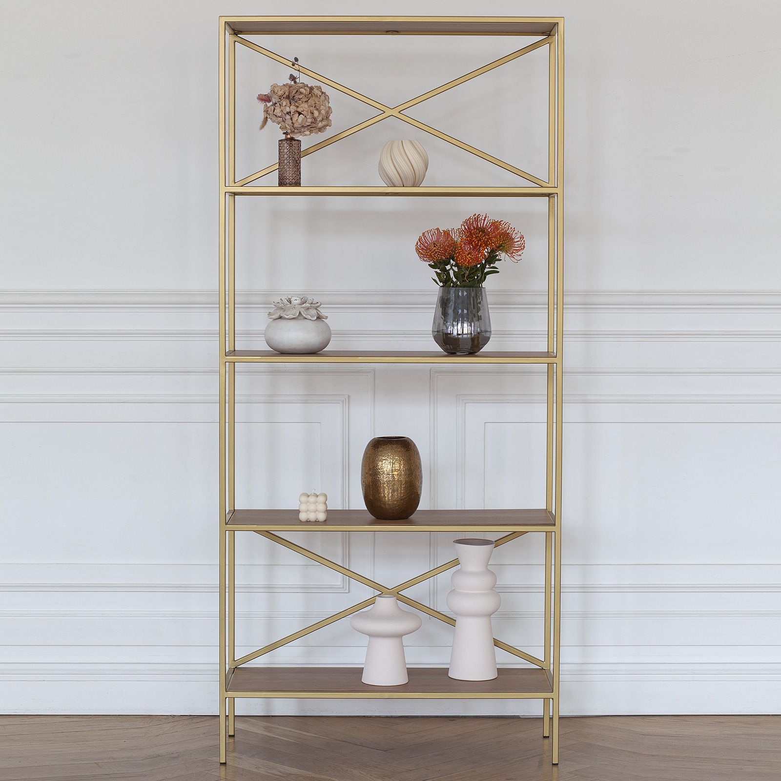 Вместительный стеллаж KARIN создает уникальный дизайн и зонирует помещение. Утонченное сочетание золотого каркаса и полок с рисунком дерева позволит разместить стеллаж в любом интерьере.
