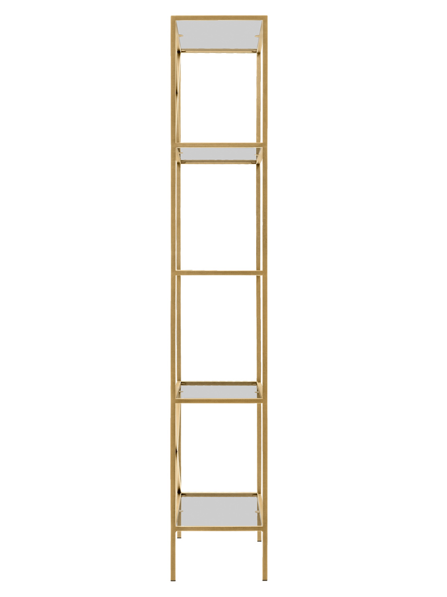 Золотой металлический стеллаж KARIN с полками из закаленного прозрачного стекла привлекает внимание элегантным дизайном и функциональностью.