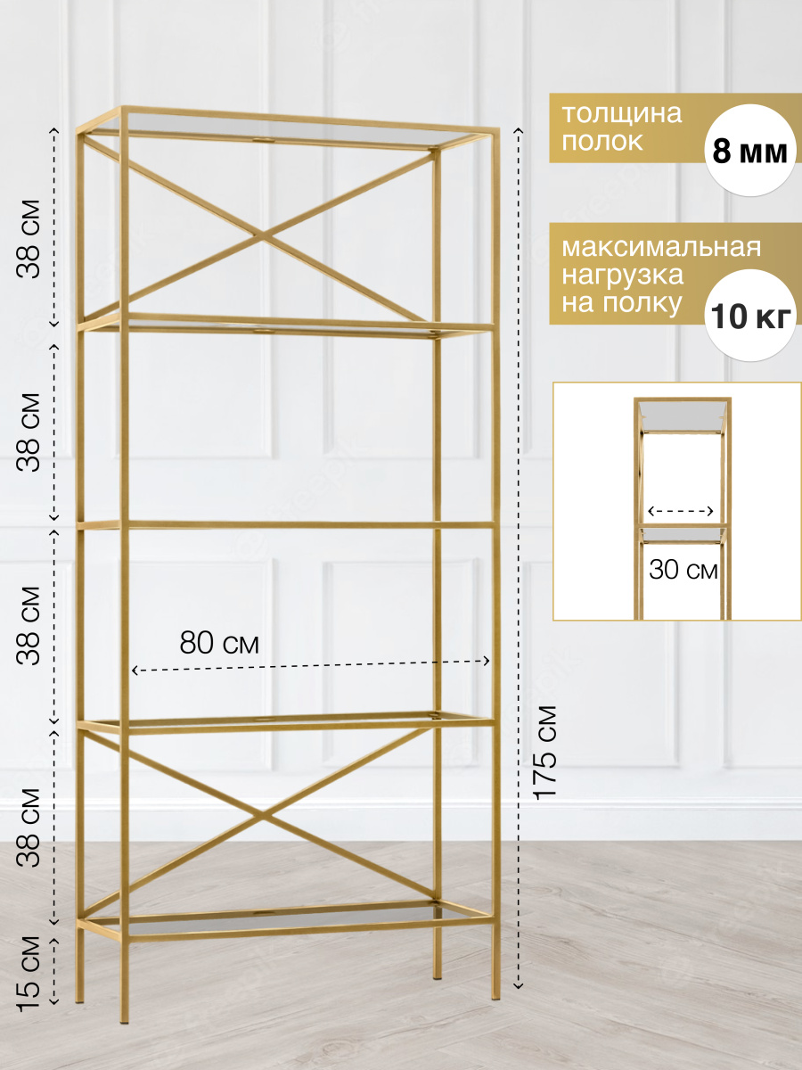Золотой стеллаж KARIN с полками из закаленного прозрачного стекла. Стеллаж в стиле лофт подойдет для квартиры, загородного дома, офиса и салона. Каркас стеллажа изготовлен из стали с полимерным покрытием.