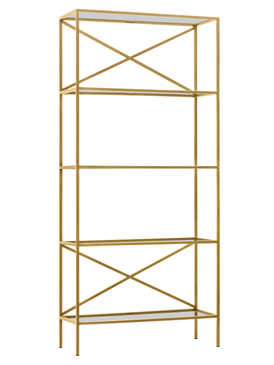 Вместительный стеллаж KARIN создает уникальный дизайн и зонирует помещение. Утонченное сочетание золотого каркаса и полок из закаленного прозрачного стекла позволит разместить стеллаж в любом интерьере.