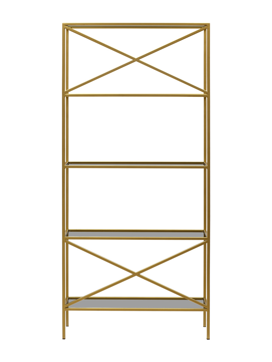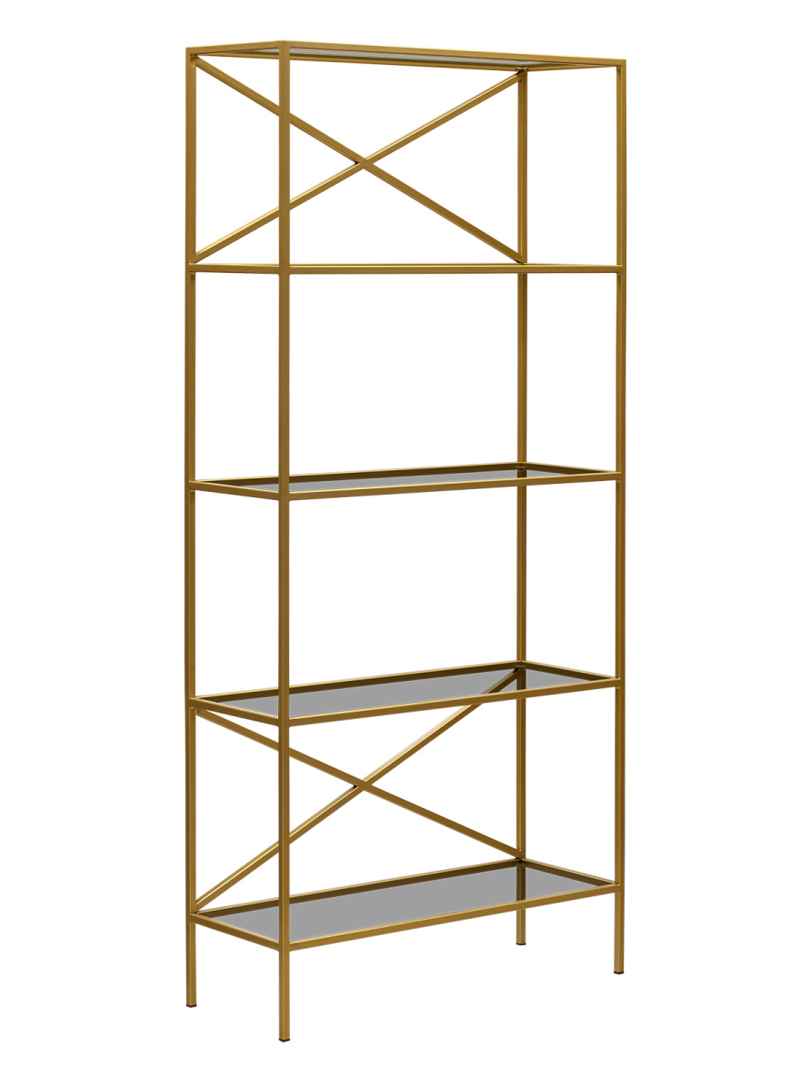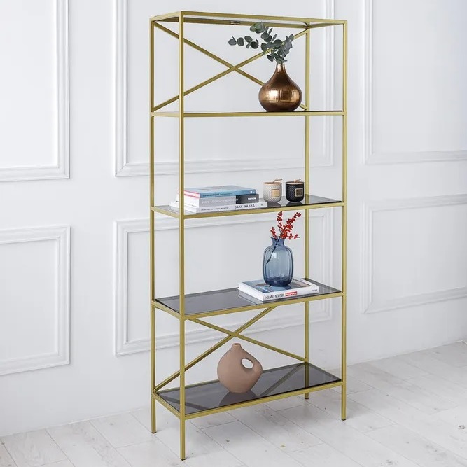 Вместительный стеллаж KARIN создает уникальный дизайн и зонирует помещение. Утонченное сочетание золотого каркаса и полок из закаленного тонированного стекла позволит разместить стеллаж в любом интерьере.