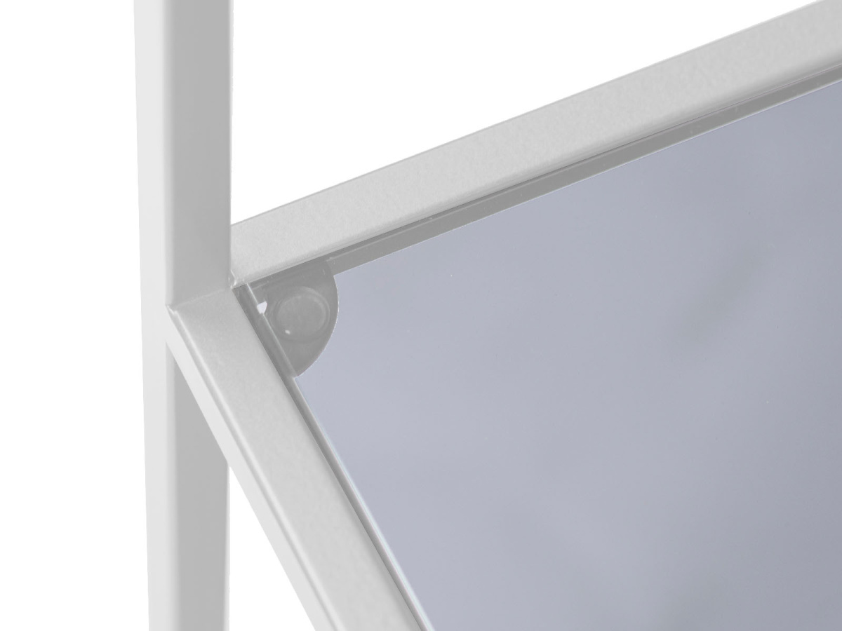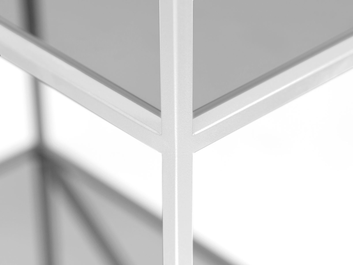 Белый металлический стеллаж KARIN с полками из закаленного тонированного стекла привлекает внимание элегантным дизайном и функциональностью.