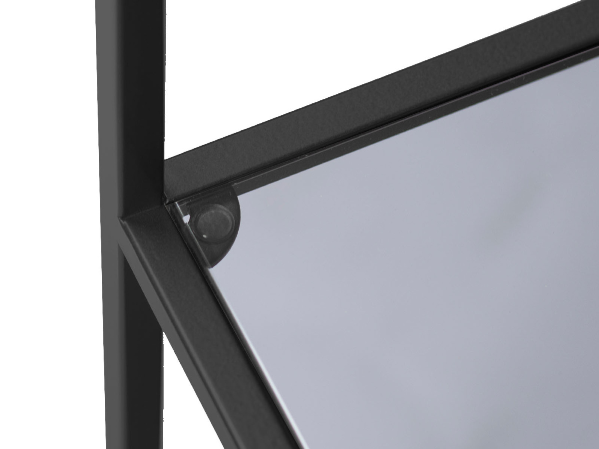 Черный металлический стеллаж KARIN с полками из закаленного тонированного стекла привлекает внимание элегантным дизайном и функциональностью.