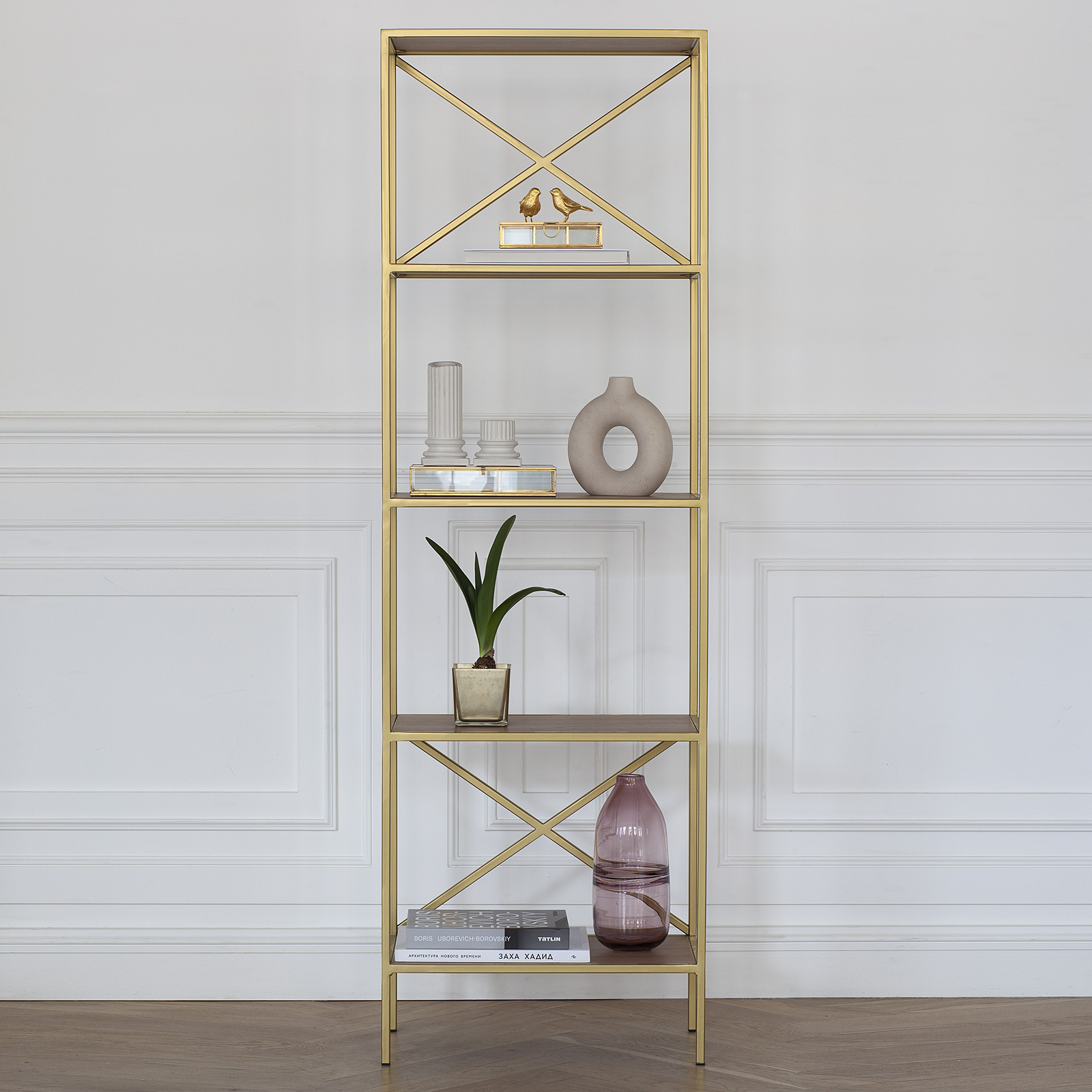Вместительный стеллаж KARIN создает уникальный дизайн и зонирует помещение. Утонченное сочетание золотого каркаса и полок с рисунком дерева позволит разместить стеллаж в любом интерьере.
