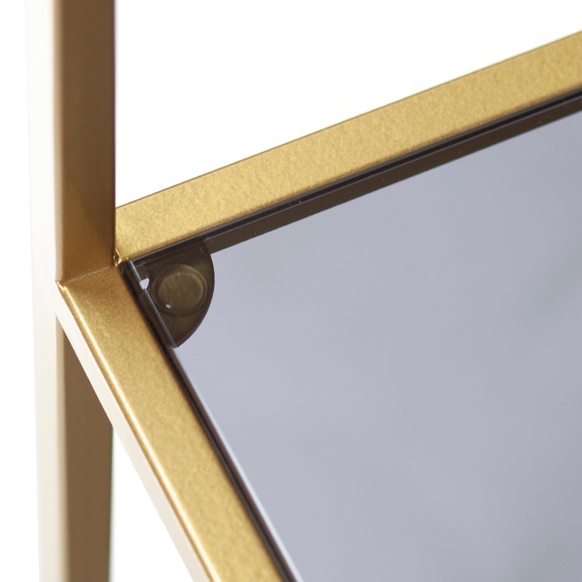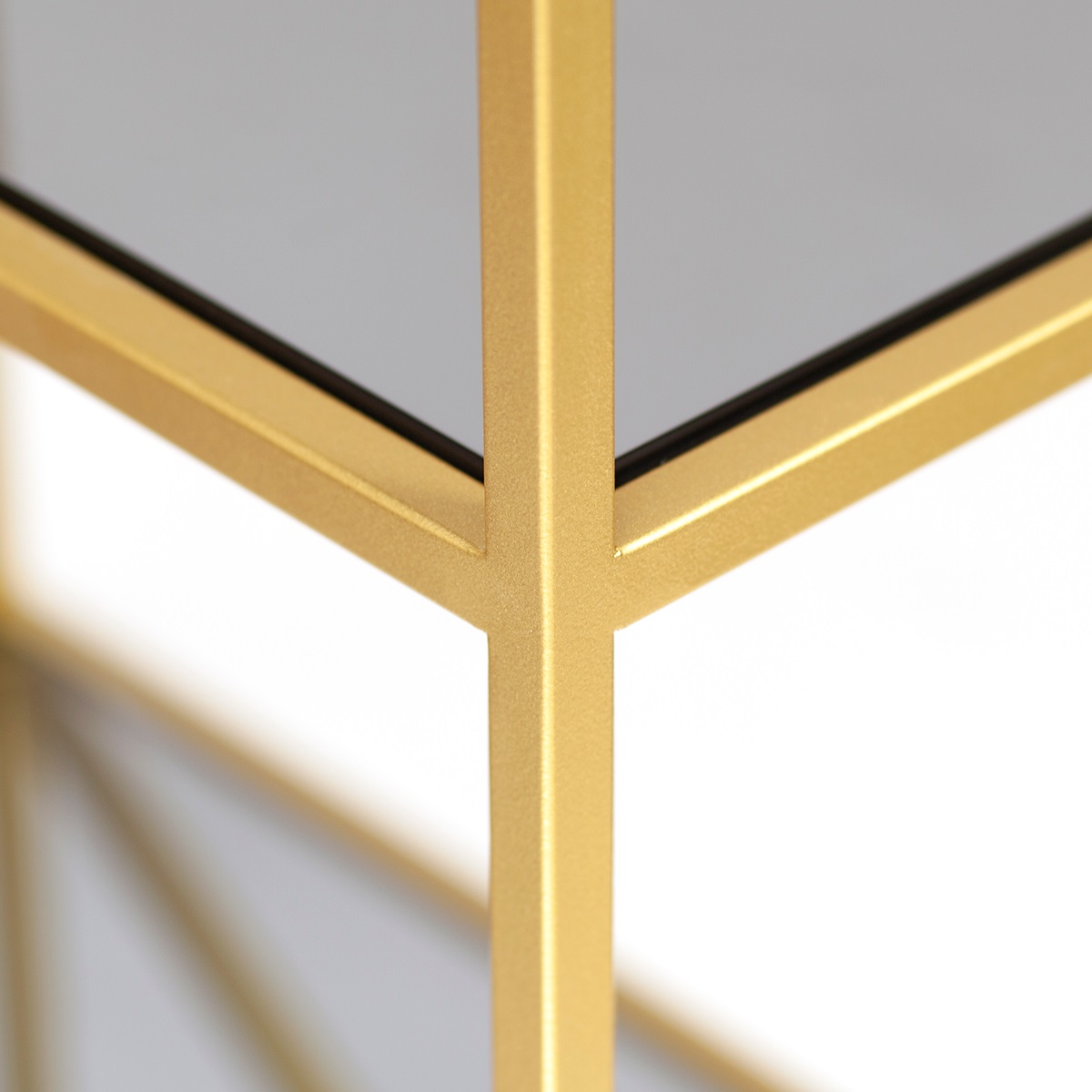 Золотой металлический стеллаж KARIN с полками из закаленного тонированного стекла привлекает внимание элегантным дизайном и функциональностью.