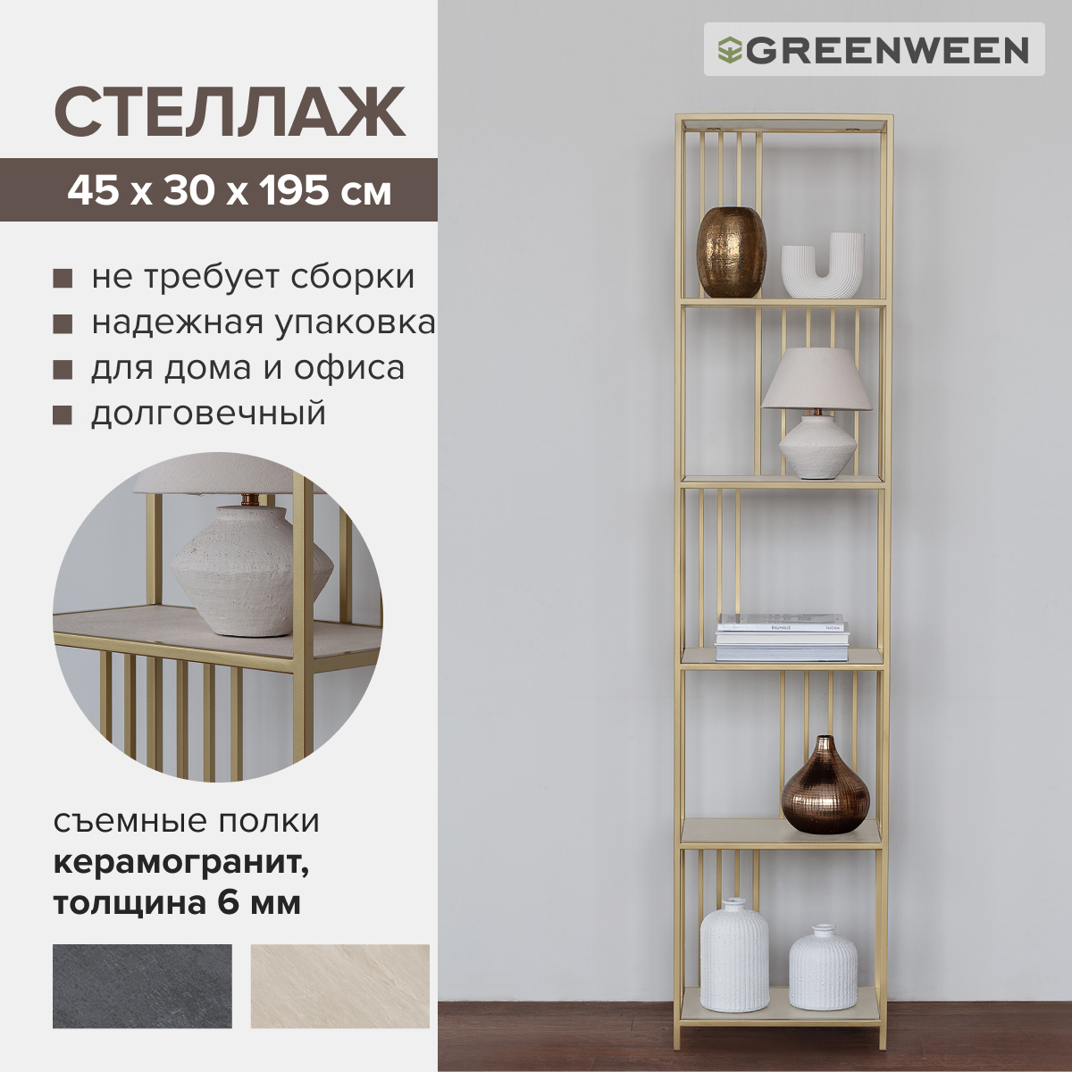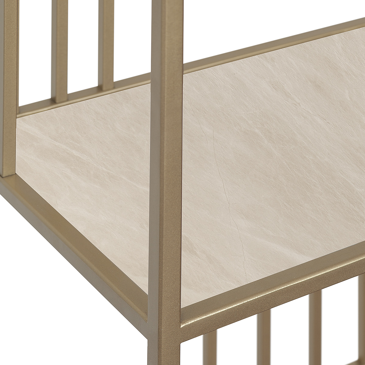Золотой металлический стеллаж SOHO MINI с полками из натурального камня отличается элегантным дизайном и функциональностью. Стальная конструкция обеспечивает прочность и долговечность.