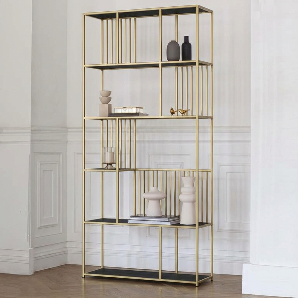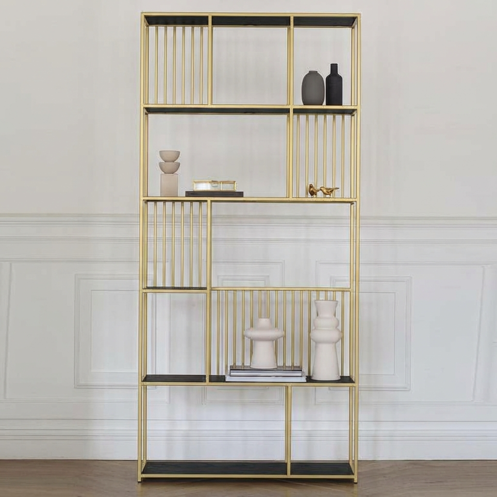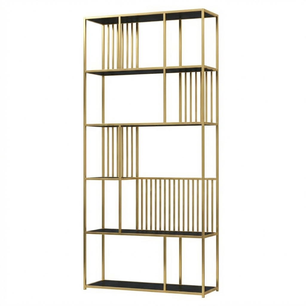 Золотой металлический стеллаж SOHO с полками из ЛДСП отличается элегантным дизайном и функциональностью. Стальная конструкция обеспечивает прочность и долговечность.