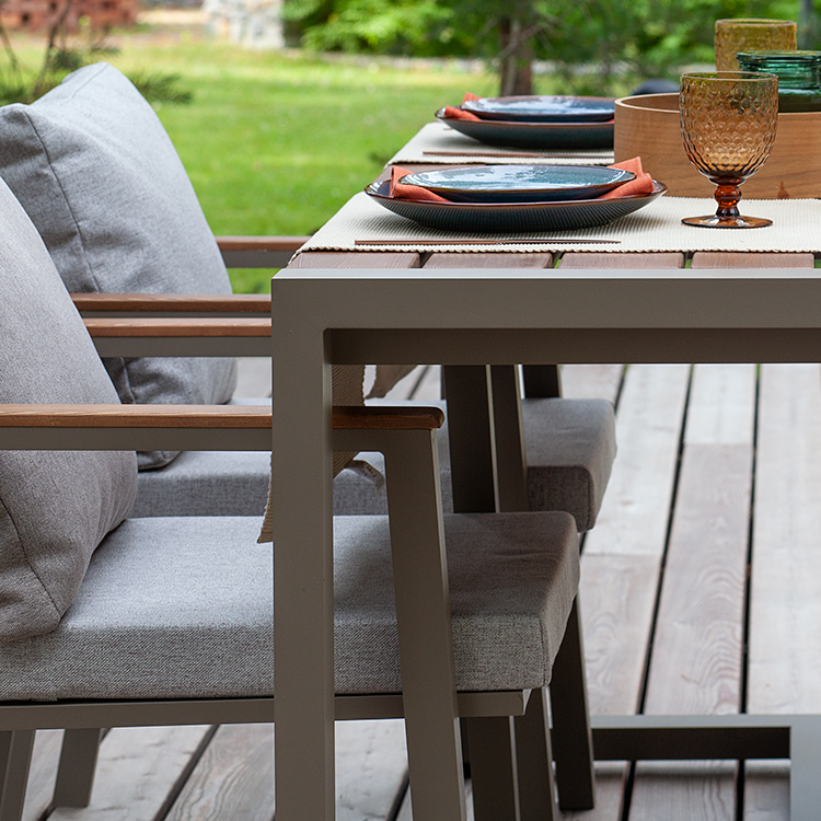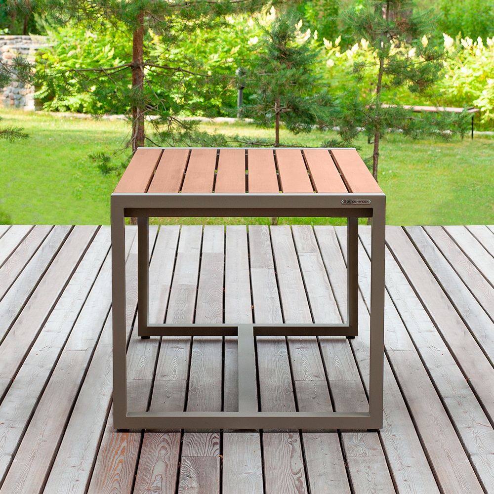 Коллекция алюминиевой мебели SANTORINI разработана дизайнерами для создания комфортной зоны отдыха в загородном доме, клубе, отеле, ресторане, жилом комплексе. Металлическая мебель органично впишется в интерьер в стиле лофт, минимализм, хай-тек. Качественные материалы позволят надолго сохранить привлекательный внешний вид мебели. Каркас стола изготовлен из алюминиевой профильной трубы 60х40 мм. Металлическое основание с матовым полимерным покрытием отличается повышенной прочностью, устойчивостью к царапинам. Современное производство Greenween гарантирует надежность и эстетику сварных швов металлической мебели. Столешница стола выполнена из массива лиственницы, деревянные ламели покрыты защитным маслом.