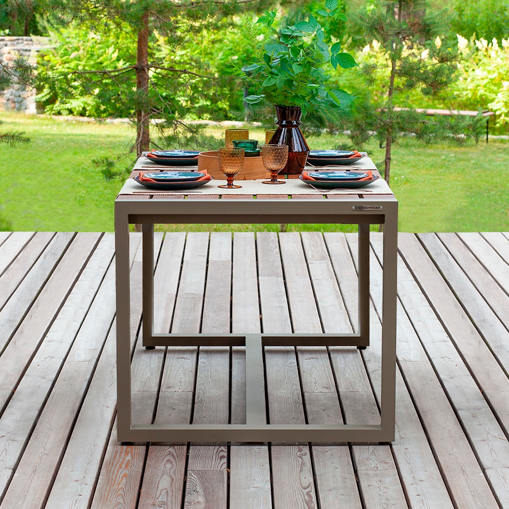 Обеденный стол из коллекции уличной мебели SANTORINI сочетает в себе элегантный дизайн и долговечность. Легкий алюминиевый каркас дополняет столешница из лиственницы. Металлический стол подходит для использования на улице и в помещении. Уличный стол в комплекте со стульями создает уютную зону для отдыха и приема гостей, за столом могут свободно разместиться 4 человека.