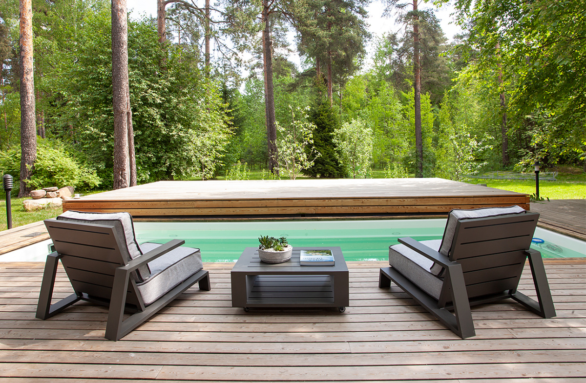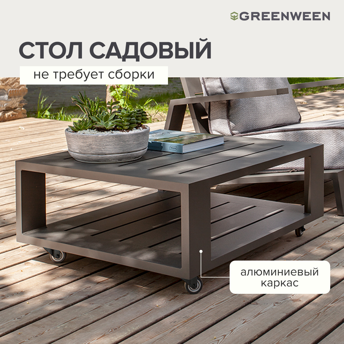 Каркас стола изготовлен из алюминиевой профильной трубы 100х25 мм. Металлическое основание с матовым полимерным покрытием отличается повышенной прочностью, устойчивостью к царапинам. Современное производство GreenWeen гарантирует надежность и эстетику сварных швов металлической мебели.