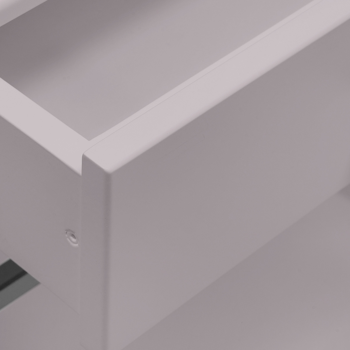 Корпус и внутренний ящик тумбы изготовлены из МДФ повышенной плотности толщиной 16 мм. Поверхность покрыта эмалью оттенка латте с матовой текстурой.