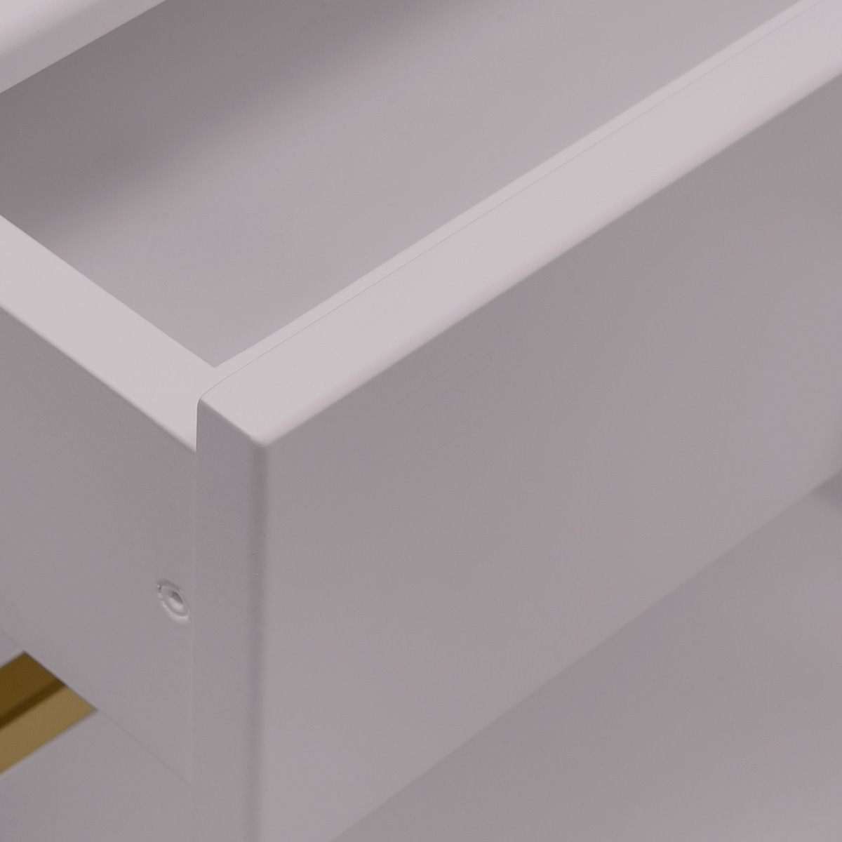 Корпус и внутренний ящик тумбы изготовлены из МДФ повышенной плотности толщиной 16 мм. Поверхность покрыта эмалью оттенка латте с матовой текстурой.